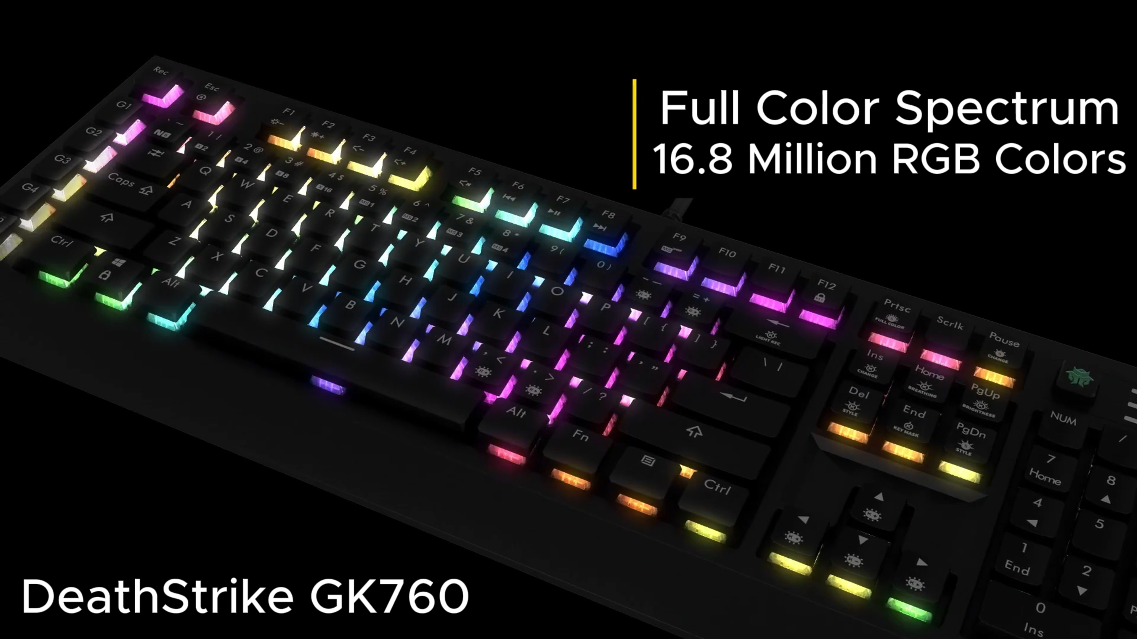 Illuminate your space with a full spectrum of RGB badassery! The DeathStrike GK760 RGB mechanical gaming keyboard features a light strip for those desk reflecting hues, while the 16.8 million RGB backlight provides illumination to your entire setup on a cosmic scale.