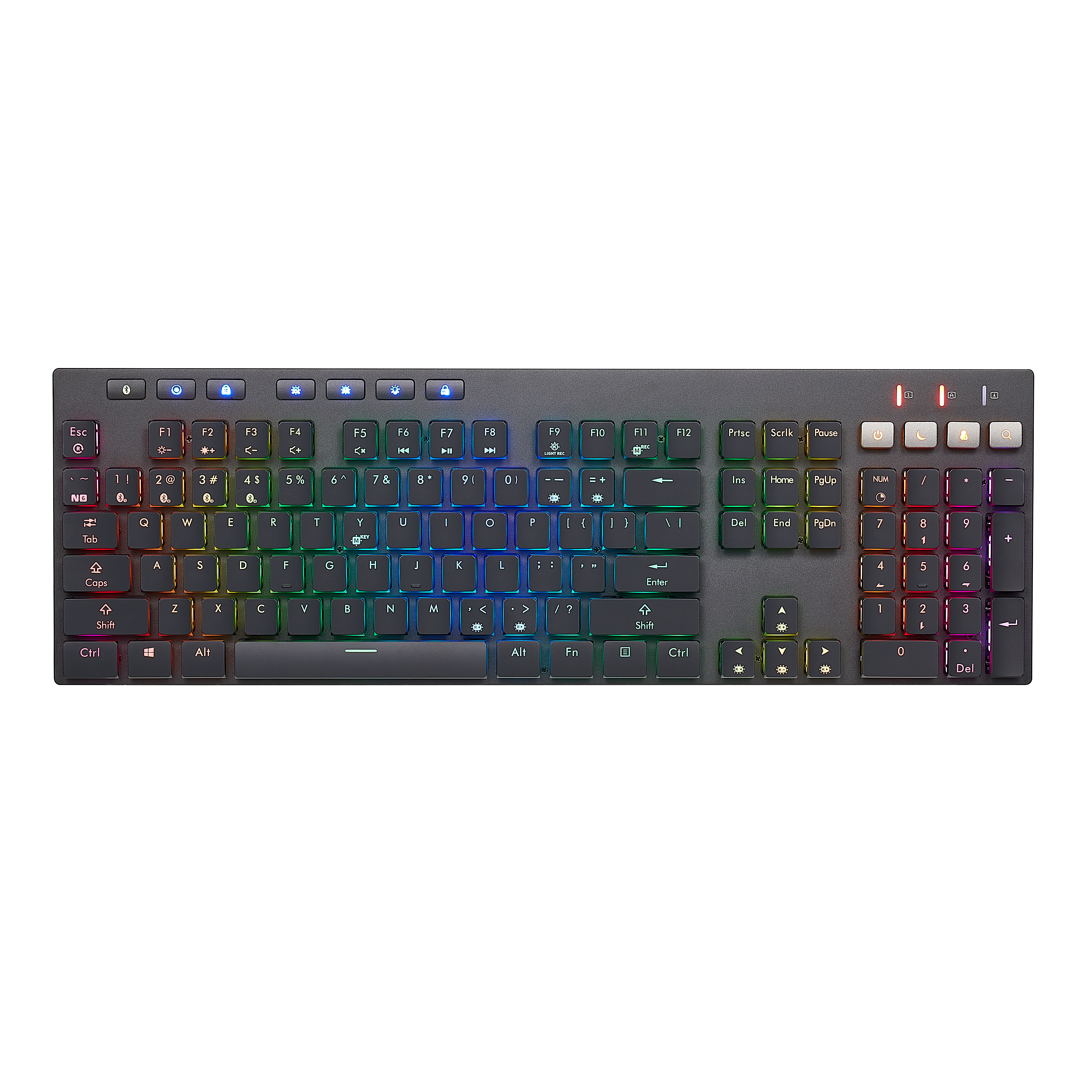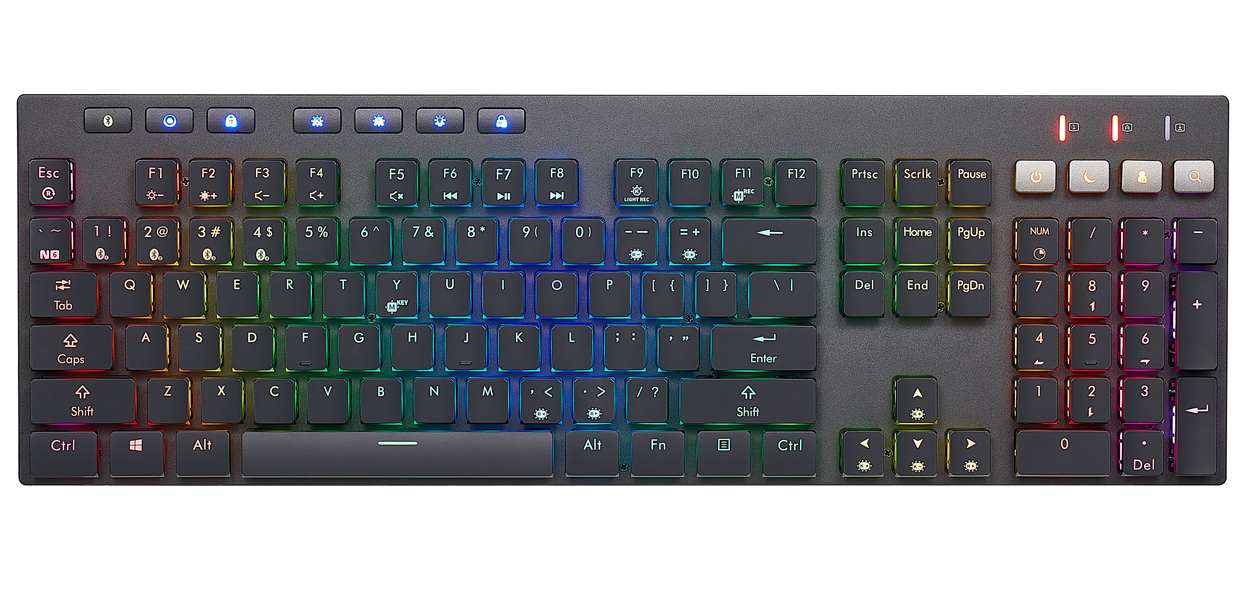 Low-profile design with 108 standard + 7 dedicated function keys reduces fatigue during marathon sessions.